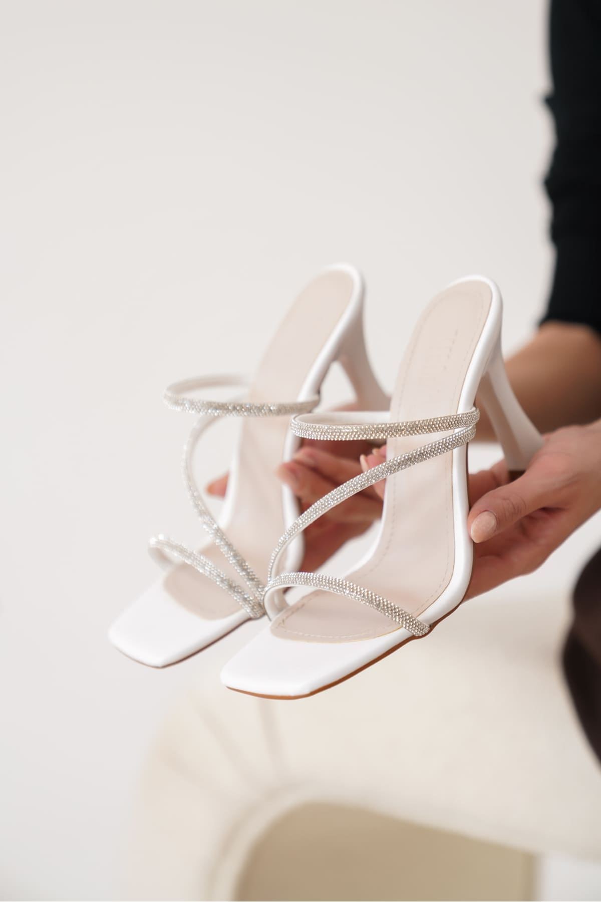 Alvina Beyaz Taşlı İnce Bantlı Kadın Topuklu Terlik