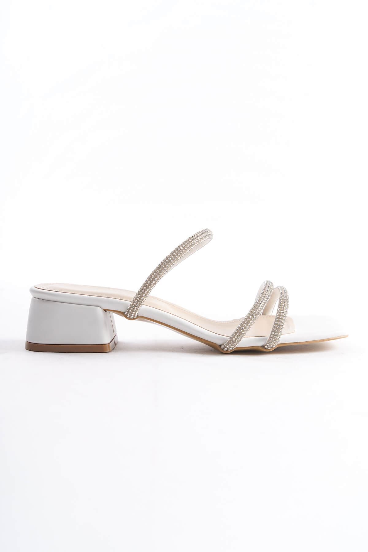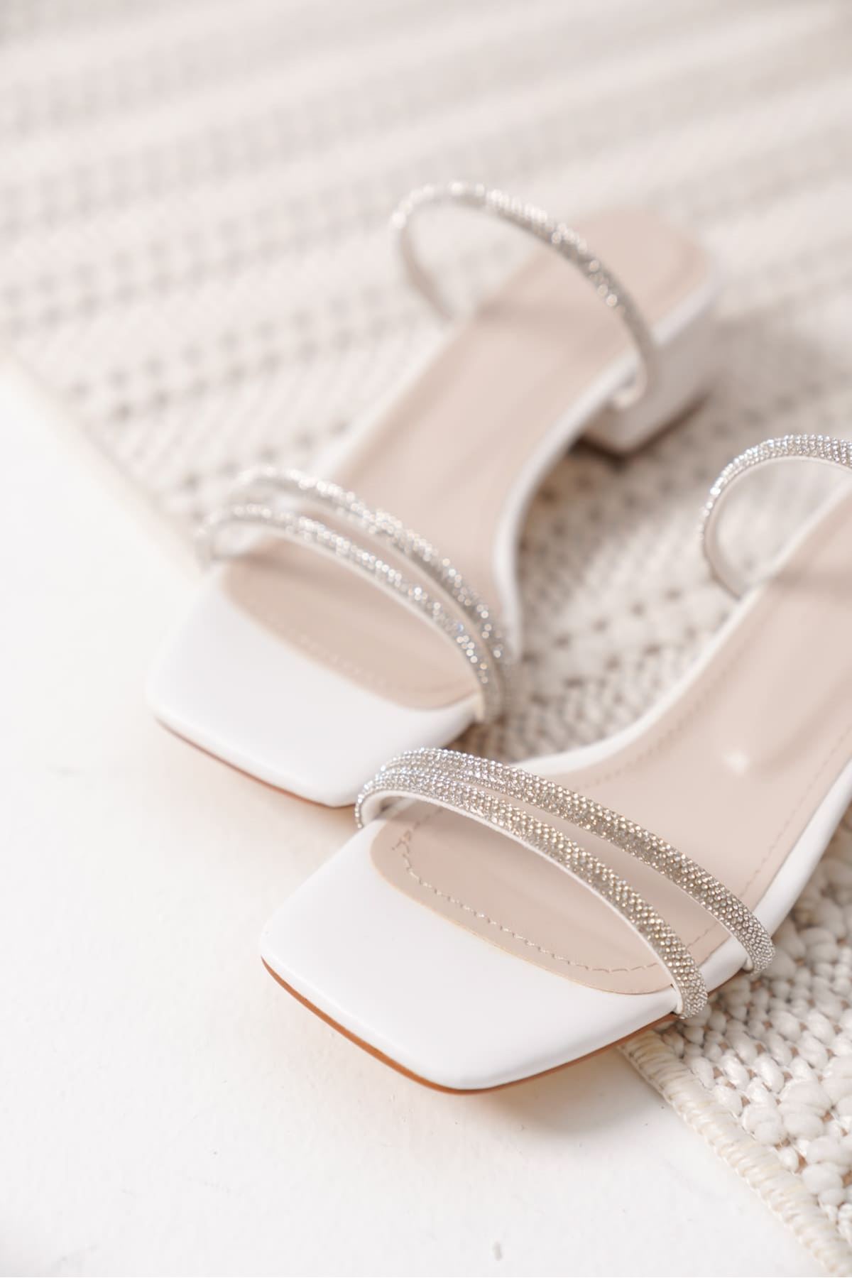 Alvina Beyaz Taşlı İnce Bantlı Kadın Topuklu Terlik