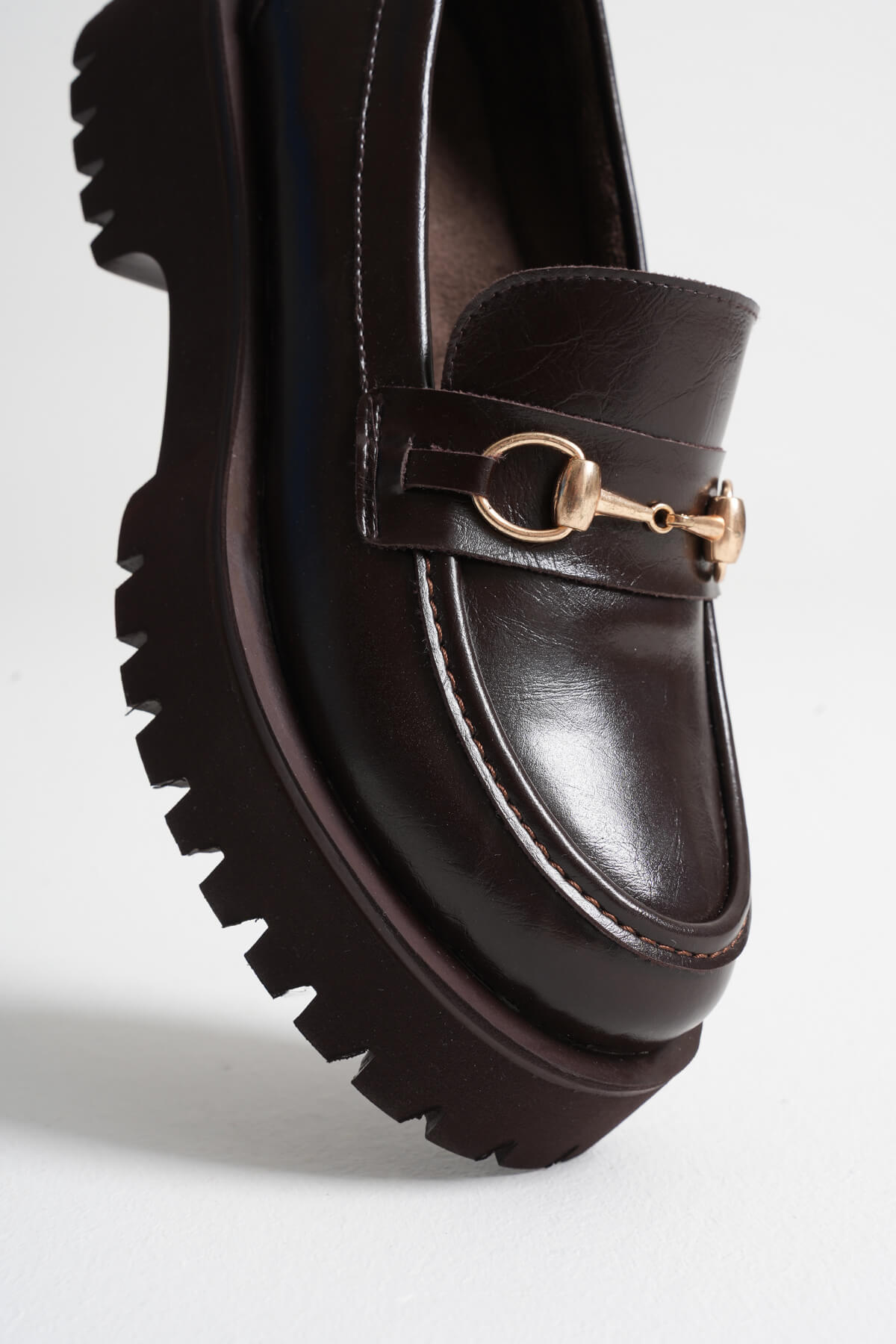 Klasik loafer çizgisini modern dokunuşlarla yeniden yorumlayan LARA, metal tokası ve kalın dişli tabanıyla güçlü bir stil sunuyor. Parlak acı kahve yüzeyi sofistike bir hava katarken, sağlam yapısı ve rahat kalıbı gün boyu konfor sağlıyor. Şehirli kadının e
