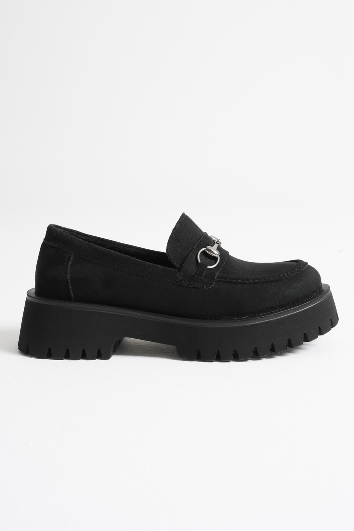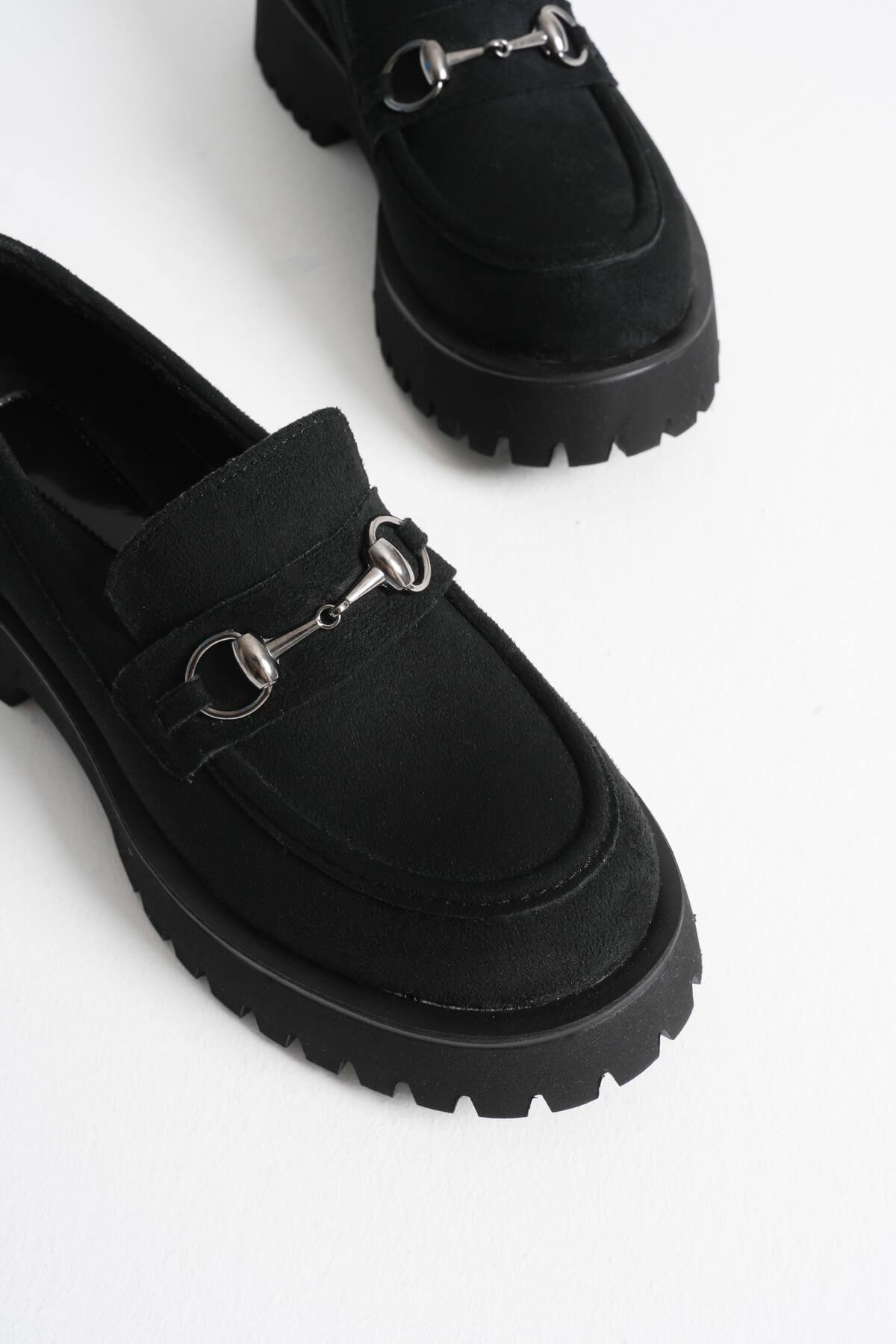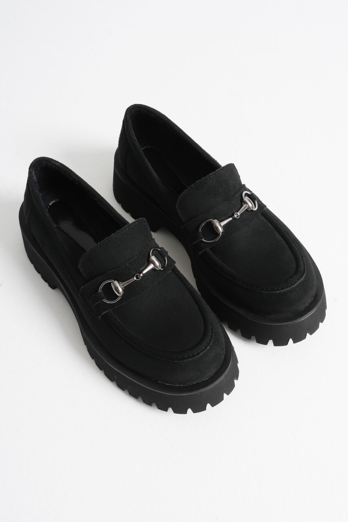 Klasik loafer çizgisini modern dokunuşlarla yeniden yorumlayan LARA, metal tokası ve kalın dişli tabanıyla güçlü bir stil sunuyor. Siyah süet yüzeyi sofistike bir hava katarken, sağlam yapısı ve rahat kalıbı gün boyu konfor sağlıyor. Şehirli kadının enerjis