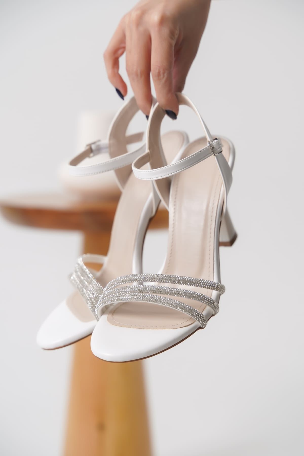 Alvina Beyaz Taşlı İnce Bantlı Kadın Topuklu Terlik