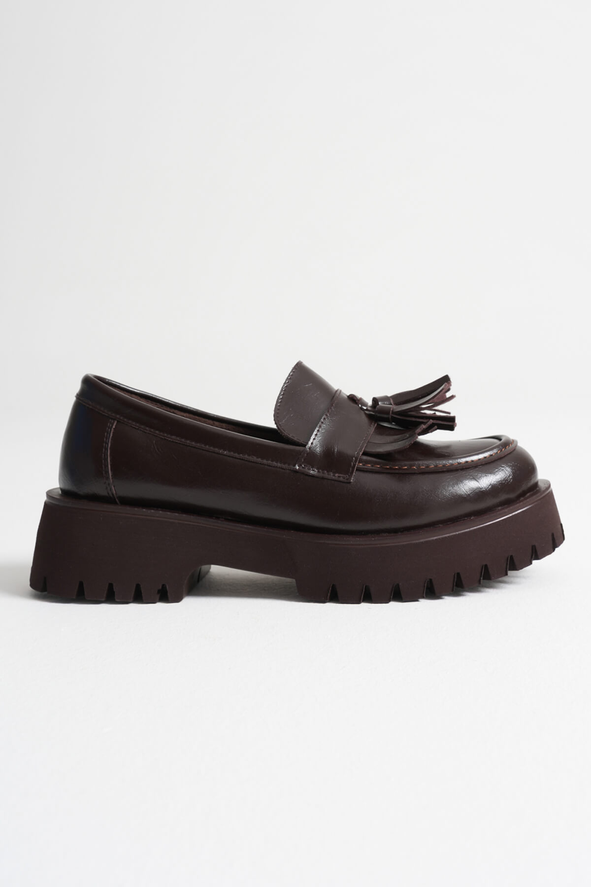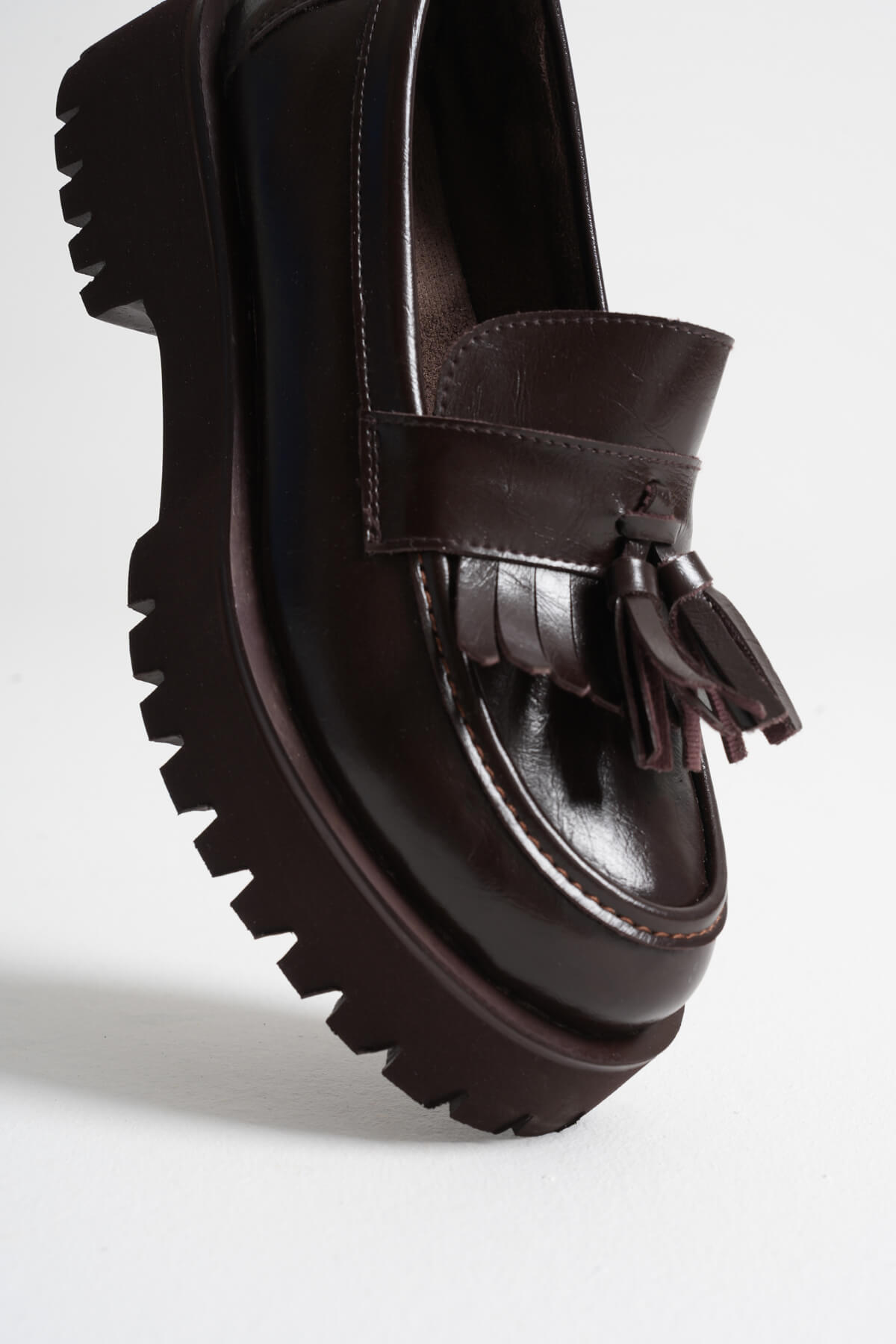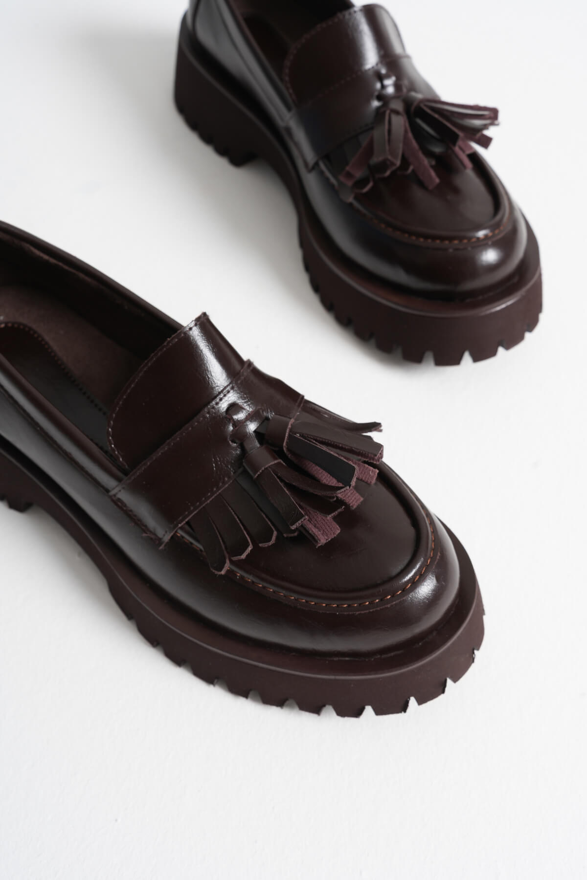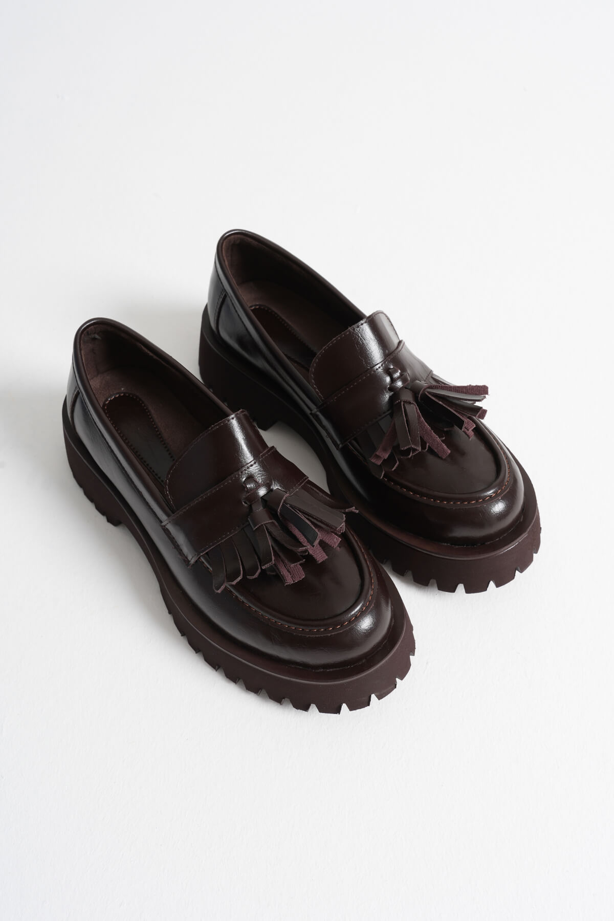 Klasik loafer tasarımına zarif püskül detayıyla farklı bir hava katan MİNA, feminen dokunuşu ve modern kalın tabanıyla güçlü bir görünüm sunuyor. Parlak acı kahve yüzeyi sofistike bir şıklık katarken, rahat kalıbı gün boyu konfor sağlıyo
