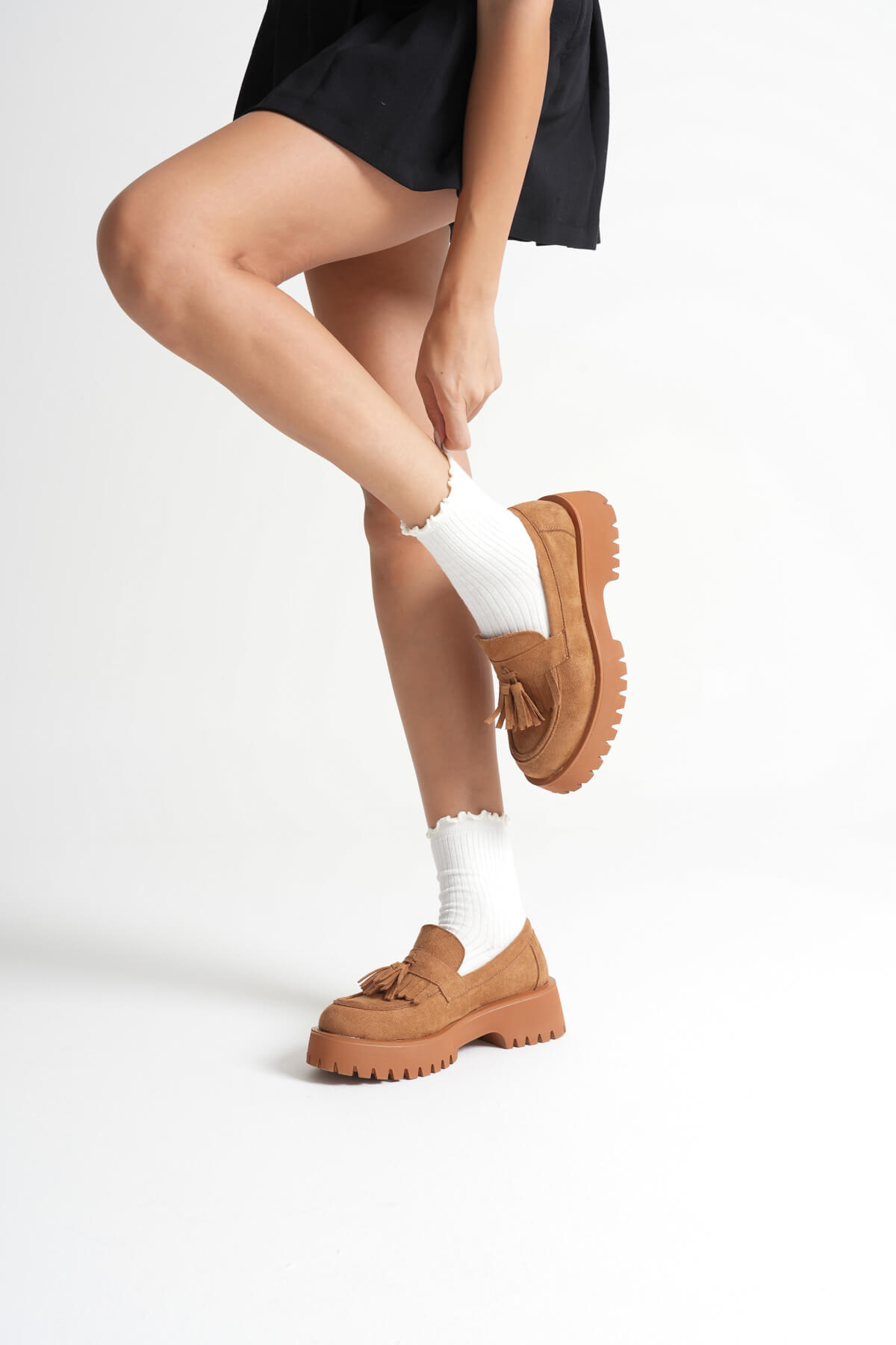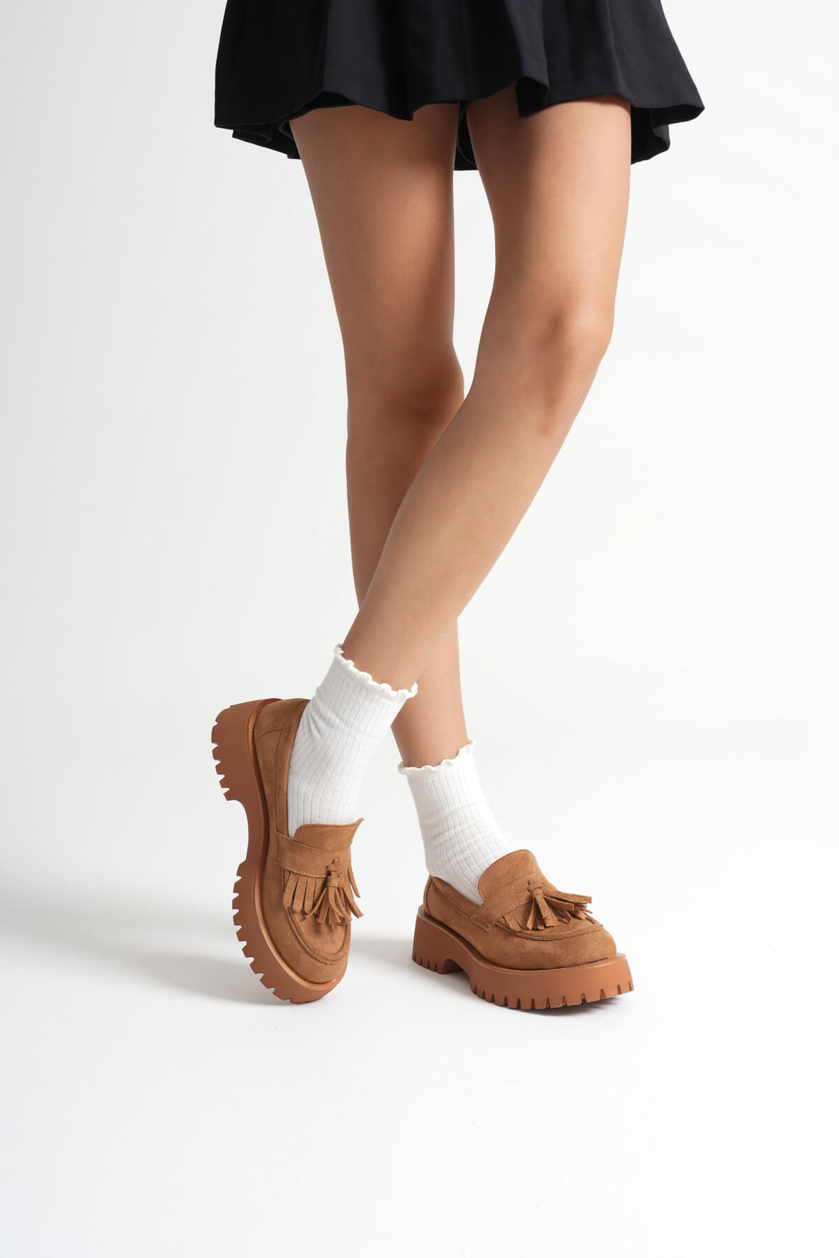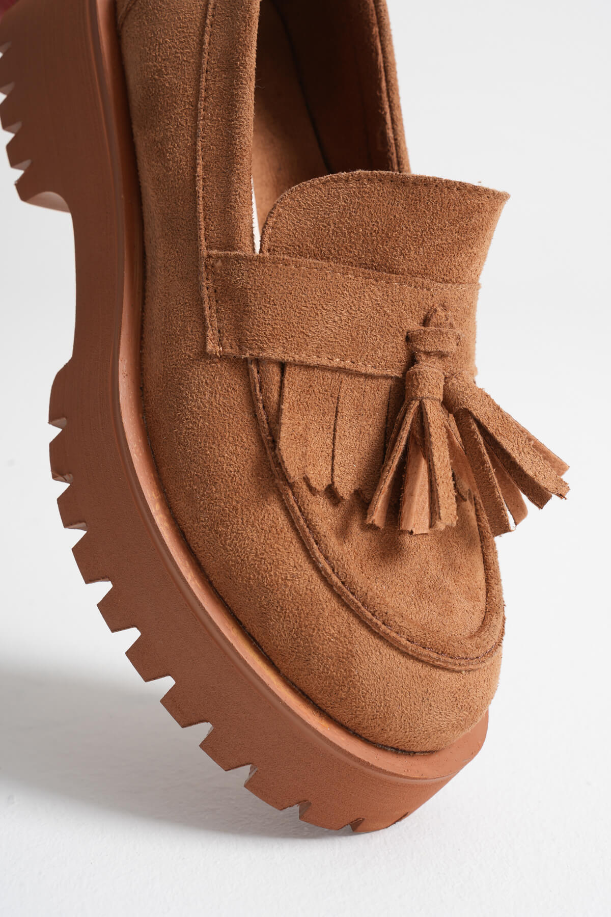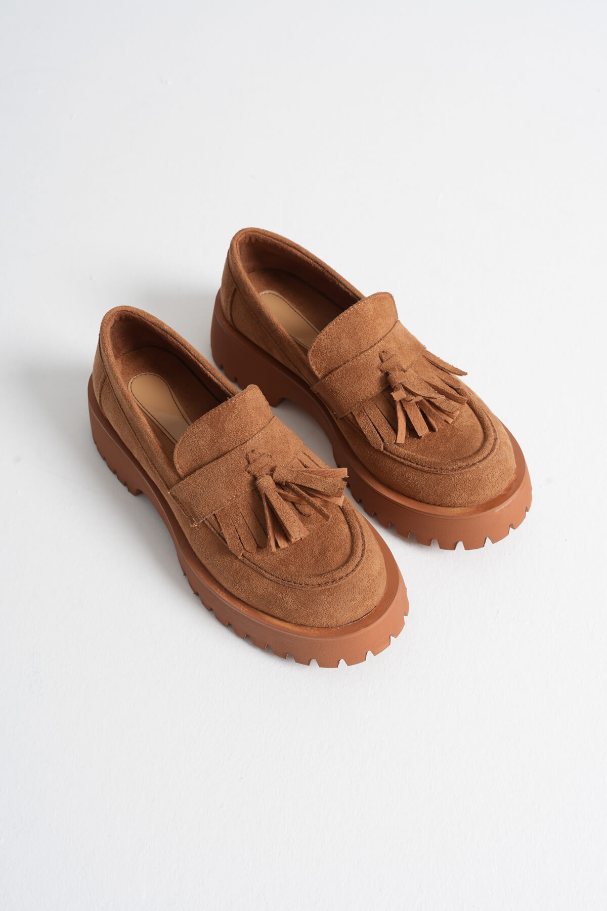 Klasik loafer tasarımına zarif püskül detayıyla farklı bir hava katan MİNA, feminen dokunuşu ve modern kalın tabanıyla güçlü bir görünüm sunuyor. Taba süet yüzeyi sofistike bir şıklık katarken, rahat kalıbı gün boyu konfor sağlıyor. Hem