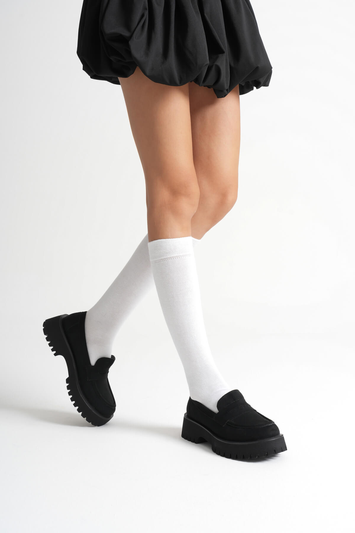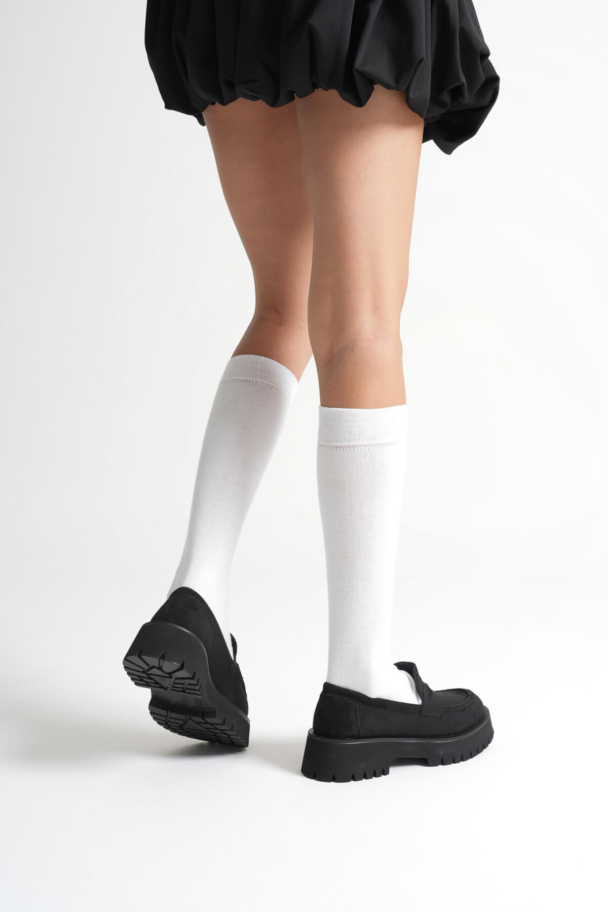 NOIR – Zamansız Çizgide Modern Loafer Klasik loafer tasarımına modern bir yorum katan NOIR, siyah süet yüzeyi ve kalın dişli tabanıyla güçlü bir duruş sergiler. Şehir hayatının dinamizmine uyum sağlayan yapısıyla hem günlük kombinlerde hem de ofis şıklığında öne çıkar. Rahat kalı